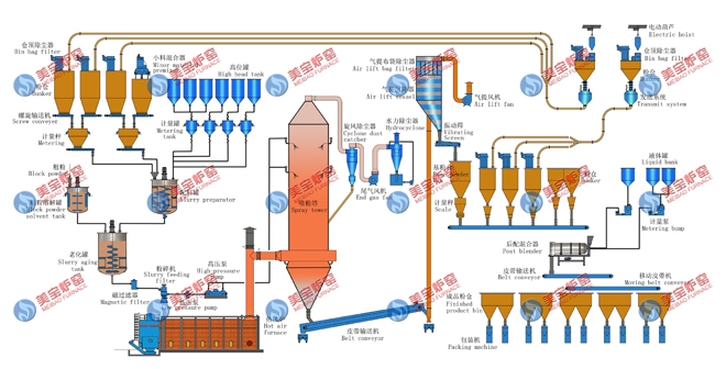 All kinds of powder materials, liquid materials are weighed respectively according to the formula, , sent to proportioning tank to make slurry, after hydrated aging, crushing and filtering by aging system, sent to top of spray tower by hi-pressure pump. Form mist particles through spray nozzles, dried by hot air generated by hot air furnace. At the bottom of the tower, hollow particles of detergent powder are formed. Then by air lifting, aging, base powder is made. After sieving, other materials (such as enzyme, color particles, essence, non-ionic, etc.) shall be added into base powder, and then put together into the post-blending mixer. After mixing and granulating, final detergent power in medium & top grade is made, and eventually packing.
